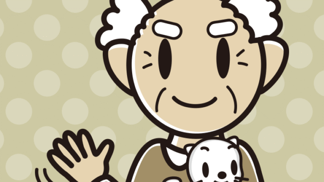 【フリー素材】猫を抱いて手を振るおじいさんのイラスト